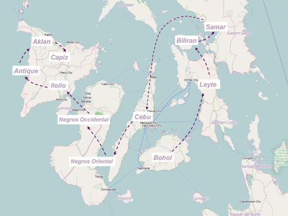 I will go to all the provinces in Visayas I have not yet been to and re-visit a few. I will join my friends who will be traveling to Bohol, go up to Leyte by myself afterwards, then Biliran, Samar, Cebu, Negros Oriental, Negros Occidental, Iloilo, Antique, Aklan, and finally Capiz (see my route in the map below). I might pay a second visit to Guimaras and Siquijor too along the way.